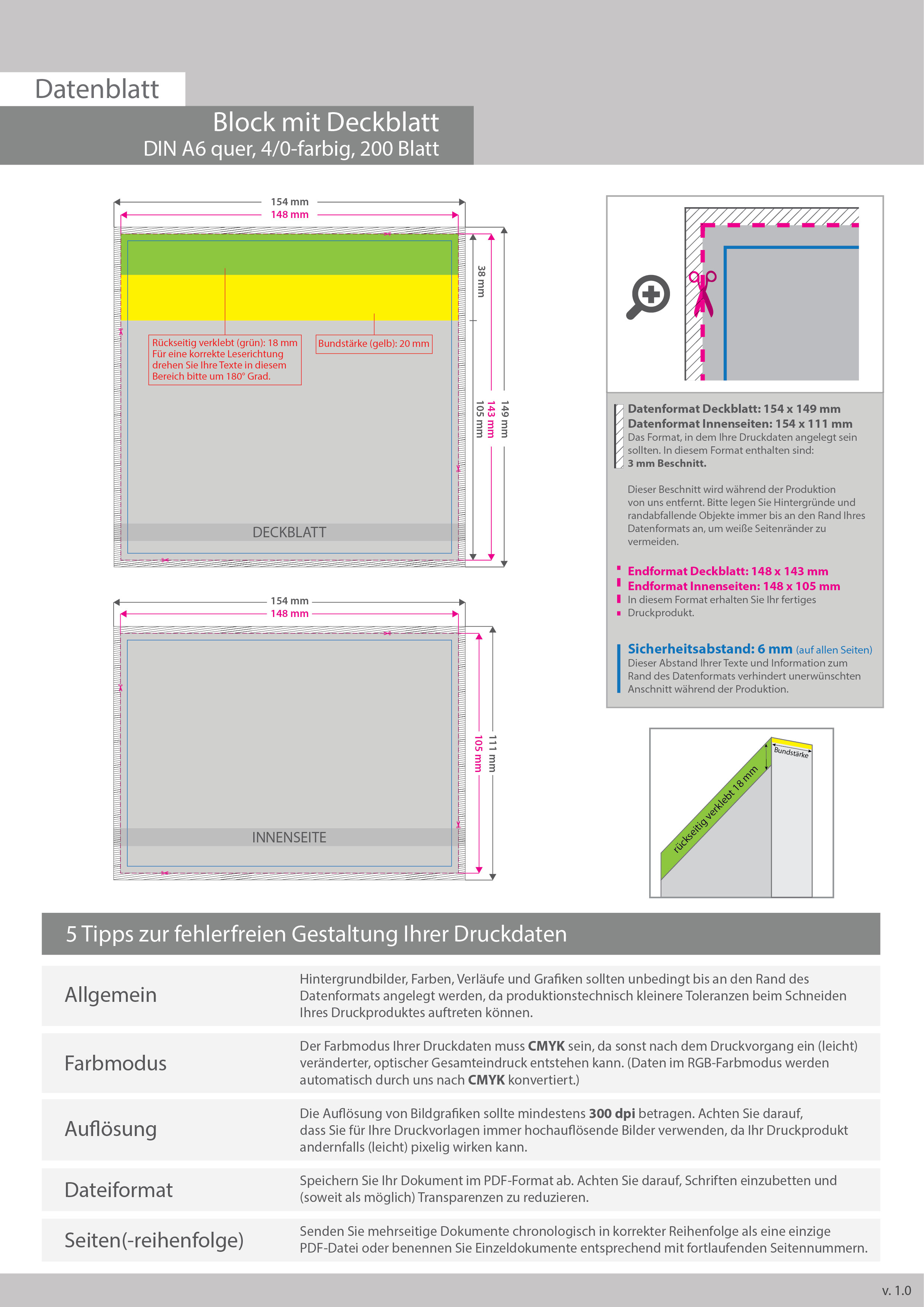 Block mit Leimbindung und Deckblatt, DIN A6 quer, 200 Blatt, 4/0 farbig einseitig bedruckt