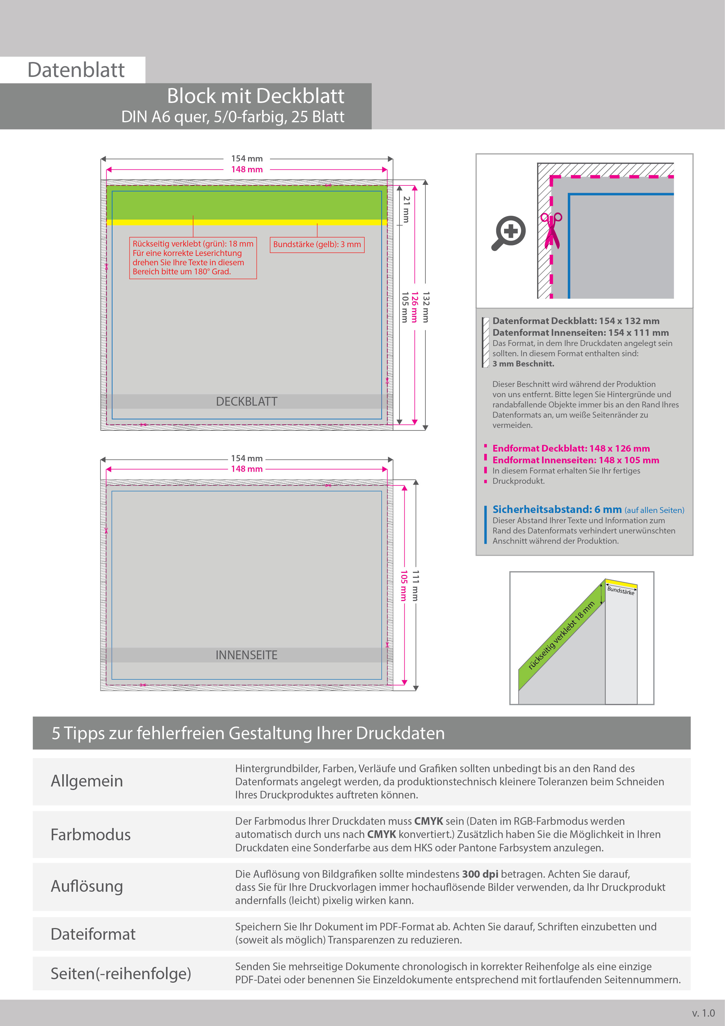 Block mit Leimbindung und Deckblatt, DIN A6 quer, 25 Blatt, 5/0 farbig einseitig bedruckt (CMYK 4-farbig + 1 Sonderfarbe HKS oder Pantone)
